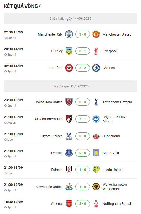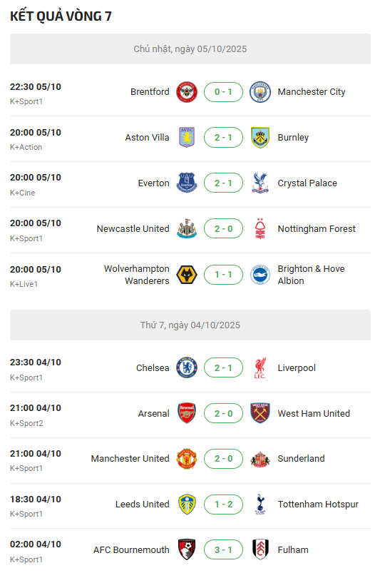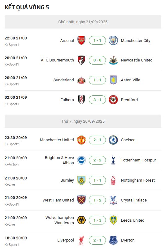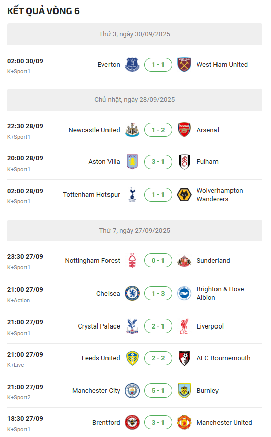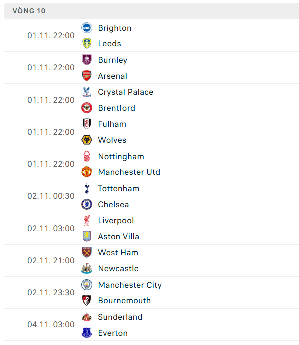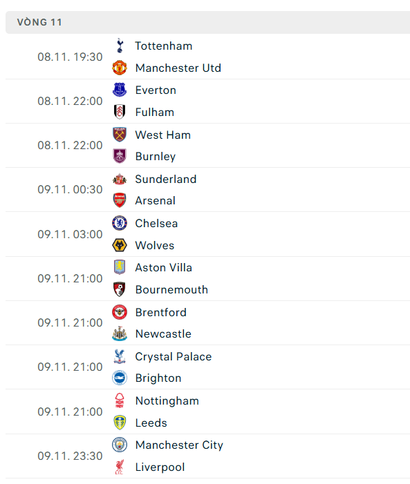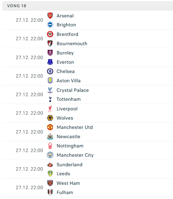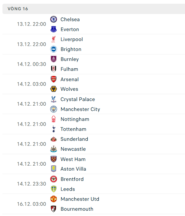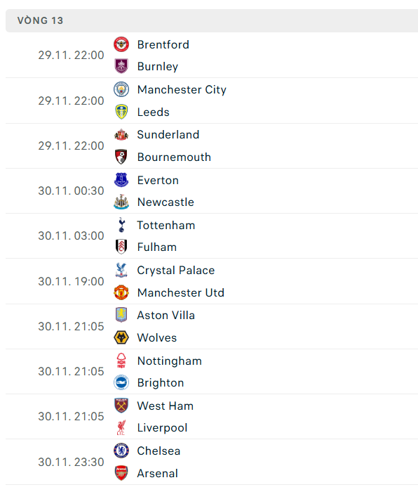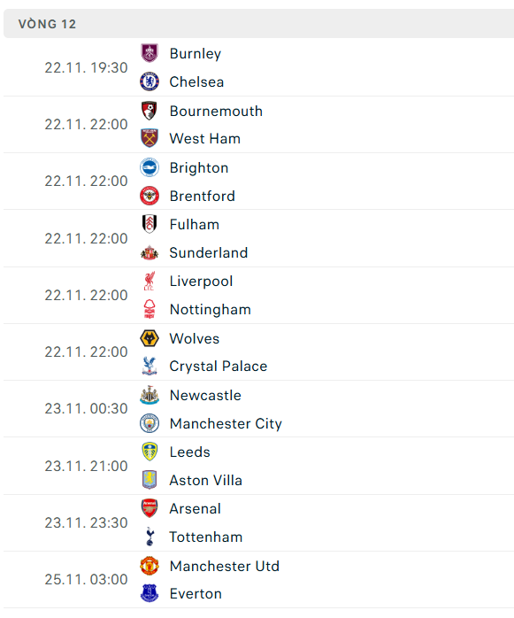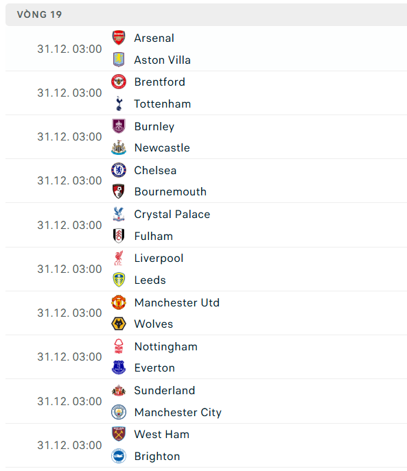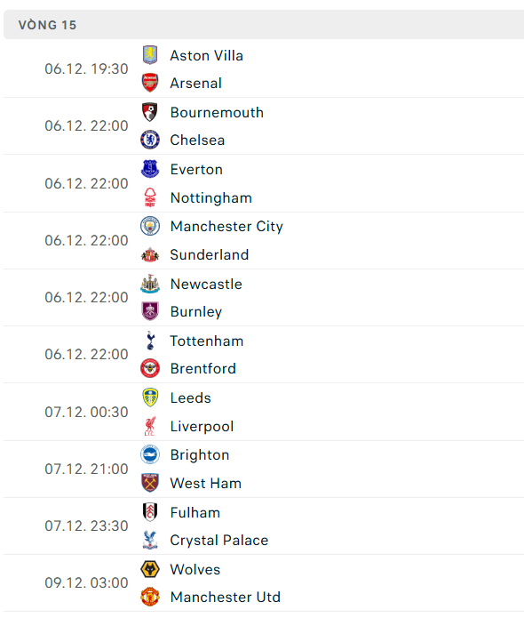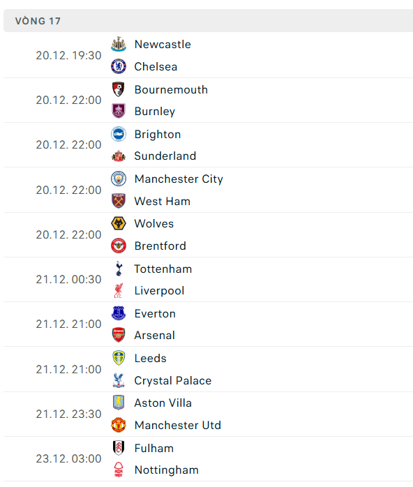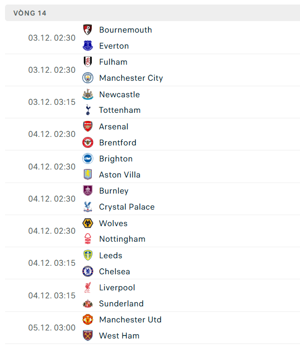 Sau đây sẽ là danh sách cập nhật lịch thi đấu ngoại hạng Anh đến hết năm 2025: