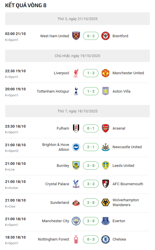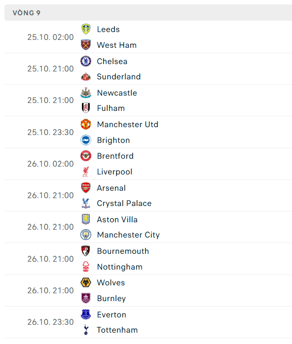 Hiện tại, giải đấu đã đi qua 8 vòng và lịch thi đấu vòng 9 ngoại hạng Anh đã được ấn định vào ngày 25/10/2025 với sự mở màn của 2 CLB là Nottingham Forest và Chelsea, hứa hẹn sẽ mang đến một vòng đấu cực kì gay cấn, kịch tính.