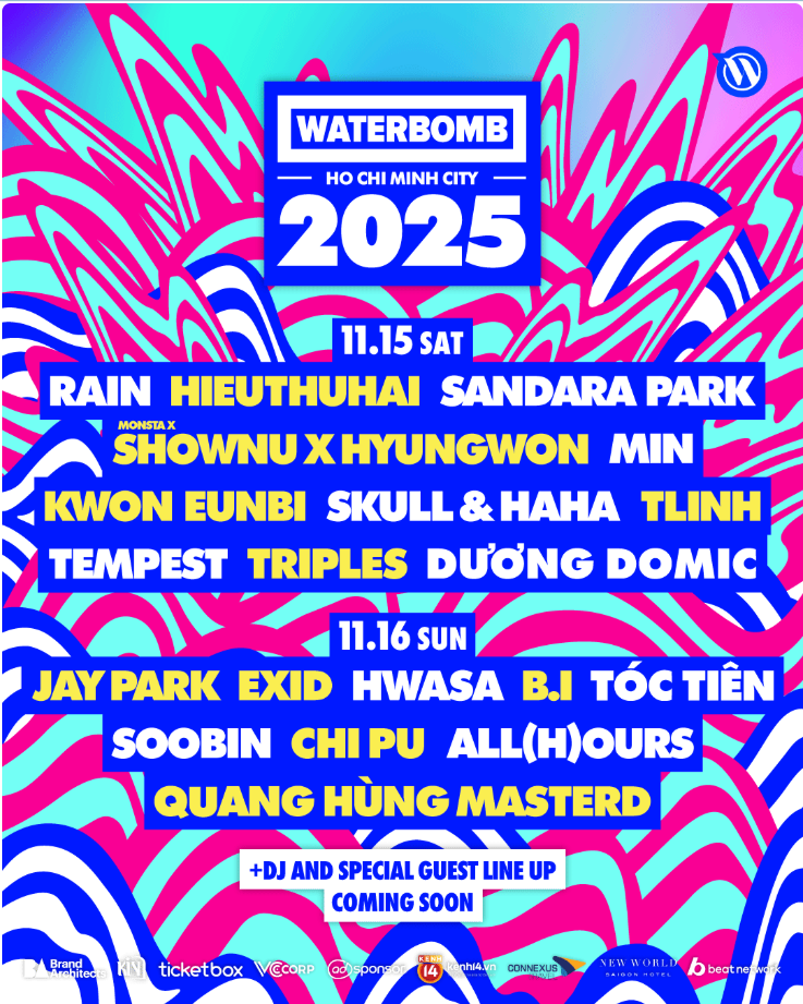 Waterbomb festival 2025 hội tụ với hơn 20 nghệ sĩ từ 3 thế hệ Kpop và Vpop như Bi Rain, Kwon Eunbi, Jay Park, EXID, B.I, HIEUTHUHAI, Tóc Tiên, Chi Pu, ...