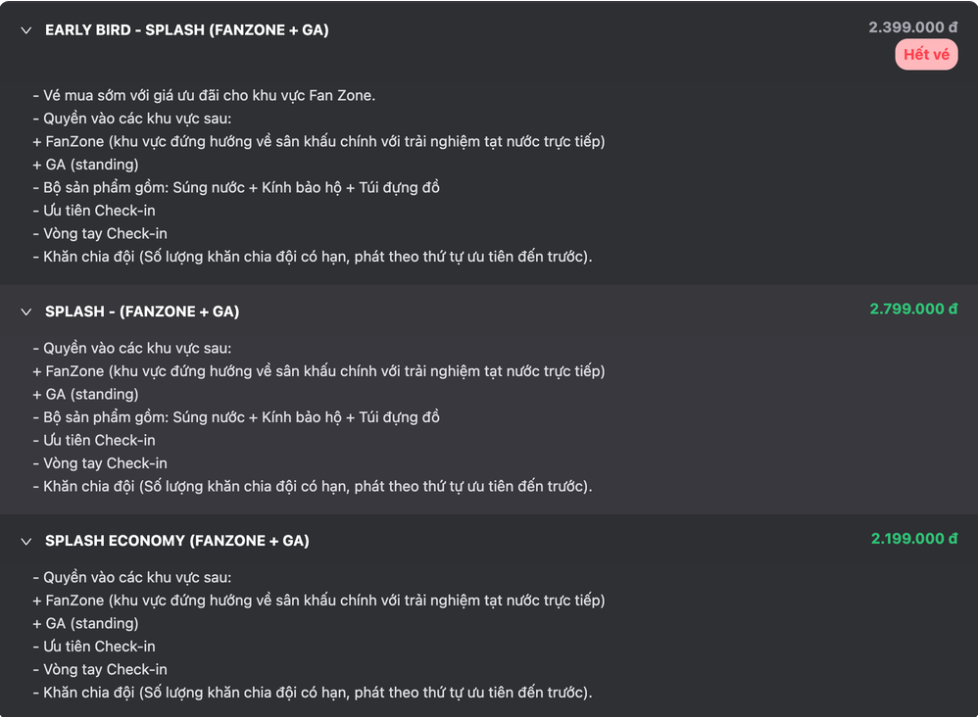 Giá vé Waterbomb 2025 Việt Nam dao động từ 899.000 VNĐ đến 4.399.000 VNĐ, tùy theo hạng vé và giai đoạn bán. Sự kiện áp dụng mô hình dynamic pricing (giá thay đổi theo từng giai đoạn), và hiện tại đang trong Phase 1, sau khi Early Bird kết thúc vào cuối tháng 9/2025.