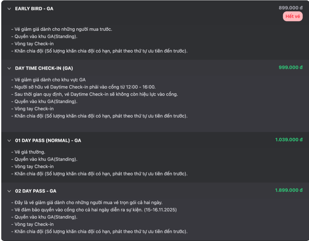 Dưới đây là bảng giá vé mới nhất được cập nhật từ Ticketbox (ngày 24/10/2025), kèm theo các quyền lợi nổi bật dành cho từng hạng vé: